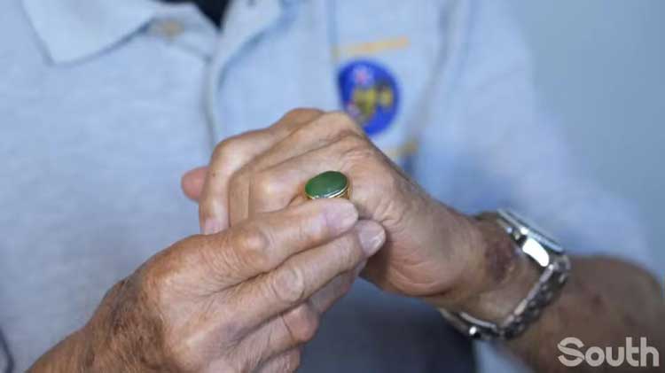 黎玉荣就珍藏着一枚由翡翠原石镶嵌而成的戒指,这源自他在缅甸公路上的一段经历。他曾遇到一位抱着孩子的饥饿妇人,他把身上所有的口粮都给了她。妇人感激之下,扔给他一块白色石头。“我当时也不知道是什么,后来带回美国后才知道那是一块翡翠原石。”他说,后来他把这块“石头”镶成戒指,看着它随岁月流逝而渐显温润绿色。